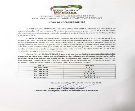 Servidores Prefeitura de São João do Sóter inicia pagamento dos servidores públicos municipais Publicada em 06/01/2021 17:30:28