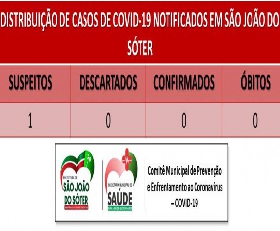 Saúde São João do Sóter registra primeiro caso suspeito da Covid-19 Publicada em 15/04/2020 11:56:08